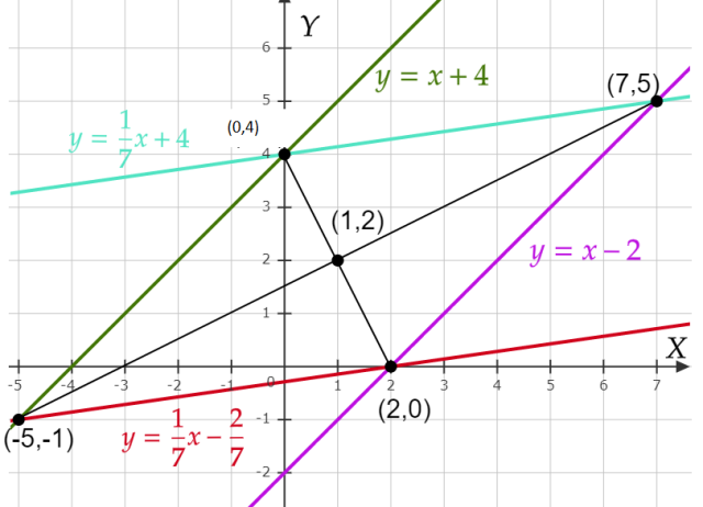Do wyznaczenia punktów przecięcia prostych, czyli wierzchołków rombu, naszkicuj podane proste w jednym układzie współrzędnych. Najpierw przekształć proste do postaci kierunkowej i stwórz ich tabelki częściowe. Wybierz dwa dowolne argumenty i wyznacz odpowiadające im wartości ze wzoru, otrzymasz w ten sposób dwa punkty z szukanej prostej. Na koniec, po naszkicowaniu rombu, zaznacz jeszcze jego przekątne i napisz współrzędne ich puntu przecięcia.