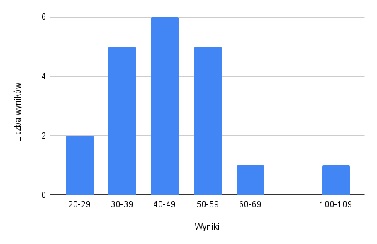 Następnie stwórz wykres kolumnowy. Na osi poziomej zapisz podane zakresy. Na pionowej osi zaznacz liczbę osób wskazujących poszczególne odpowiedzi (wartość maksymalna musi być co najmniej taka jak największa liczba osób wskazujących ten sam przedział). Następnie zarysuj słupki wskazujące, ile odpowiedzi zawiera dany przedział.