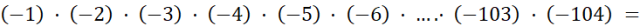 Są 104 takie liczby (od -1 do -104). Wynik będzie dodatni, bo jest mnożenie parzystej ilości liczb ujemnych (104 to liczba parzysta). Dla ułatwienia możesz sobie zobrazować to tak: liczba ujemna razy liczba ujemna w wyniku daje liczbę dodatnią, więc pomnóż liczbę pierwszą z drugą, trzecią z czwartą, piątą z szóstą. Wtedy okaże się, że zamiast mnożenia stu dwóch liczb ujemnych, masz mnożenie pięćdziesięciu jeden liczb dodatnich, czyli wynik jest dodatni.