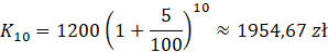 W tym zadaniu musisz obliczyć wartość stanu konta z oprocentowaniem p%, z kwotą K zł na n lat, jeśli K = 1200, p% = 5%, n = 10.