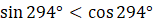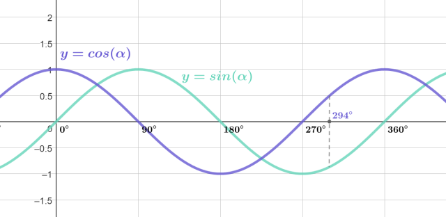 Dane są liczby sin 294° i cos 294°. Wskaż, która z nich jest większa. W tym celu narysuj w jednym układzie współrzędnych wykresy funkcji y = sin α oraz y = cos α.