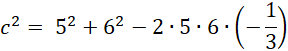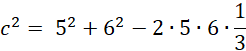 W tym zadaniu musisz obliczyć cosinus kąta wyznaczonego przez dwa boki trójkąta – a i b, mające długość odpowiednio 5 i 6, a następnie obliczyć długość trzeciego boku – c, wiedząc że pole tego trójkąta wynosi