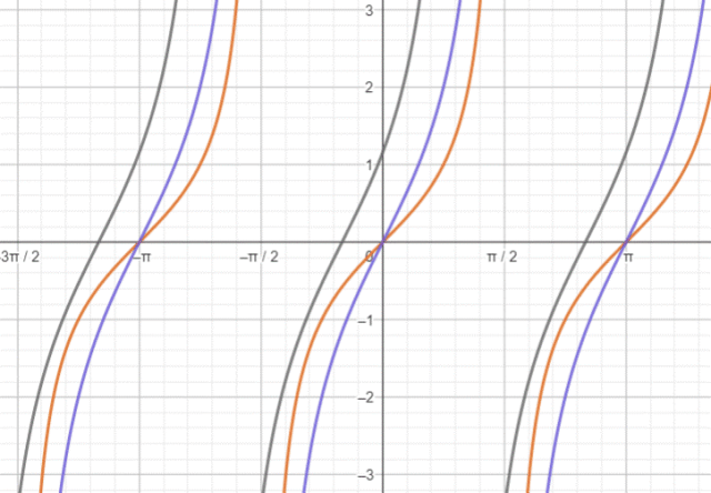 (kolor pomarańczowy). Następnie przekształć go przez powinowactwo prostokątne o osi OX i skali 2 (kolor fioletowy). Na koniec przesuń wykres o wektor