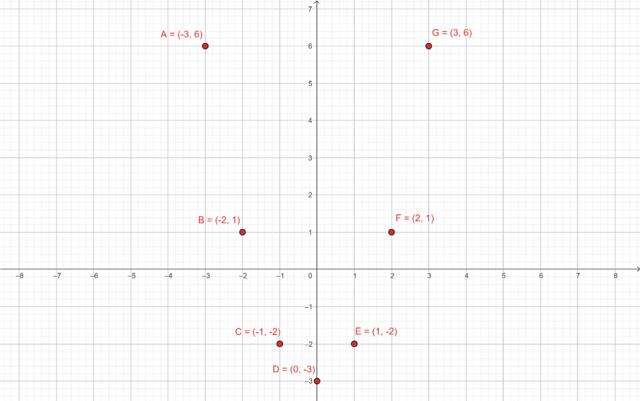 . Każdy argument x podnosimy do kwadratu, a następnie do uzyskanej wartości odejmujemy trójkę. Wykres tej funkcji jest symetryczny względem osi OY, dlatego przyjmuje 4 różne wartości – jest to parabola o ramionach skierowanych w górę.