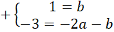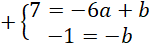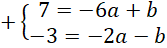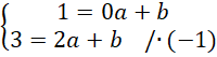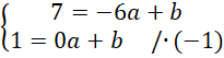 . Zauważ, że powstanie układ dwóch równań z dwoma niewiadomymi. Całe drugie równanie pomnóż przez -1, aby współczynniki przy b były przeciwne, a następnie wyznacz wartość współczynnika a dodając do siebie równania stronami. Podstaw wyznaczoną wartość a pod jedno z początkowych równań i na tej podstawie wyznacz wartość współczynnika b.