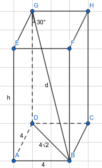 Wyznacz długość przekątnej graniastosłupa prawidłowego czworokątnego, którego krawędź podstawy ma długość 4 cm, a przekątna ta tworzy z jedną z krawędzi bocznych kąt