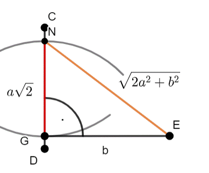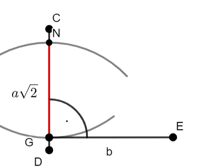 –przenieś odcinek a√2 za pomocą cyrkla: czyli narysuj dowolny odcinek, rozstaw cyrkla ustaw, na długość odcinka a√2 i z punktów C i D narysuj łuki–punkty przecięcia są oddalone od siebie o odległość a√2, a z punkt G narysuj odcinek prostopadły do NG, o długości b oznacz krańcowy punkt jako E