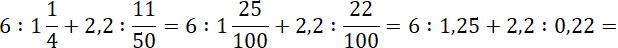 Na początek rozszerz ułamki do mianownika równego 100. Następnie przepisz cyfry całości bez zmian i zapisz część ułamkową w postaci dziesiętnej: ułamek ma tyle miejsc po przecinku, ile zer było w mianowniku, liczbą po przecinku jest liczba z licznika. Licząc wartość wyrażenia, nie zapominaj o kolejności wykonywania działań: najpierw dzielenie, a po nim dodawanie.