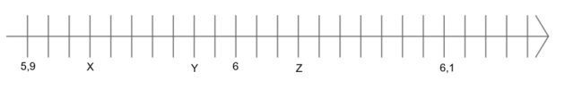 Jedna kreska na osi liczbowej to 0,01. Odejmij od siebie współrzędne punktów X i Z i podziel na 2, aby otrzymać odległość środka odcinka XZ od punktu X lub Z.
