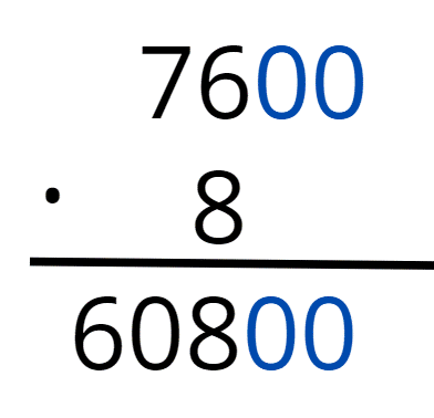 W tym zadaniu musisz policzyć podane iloczyny, zapisując pod sobą cyfry, a zera wyłączając poza iloczyn. W przypadku mnożenia przez 10, do iloczynu dopisuje się jedno zero, w przypadku mnożenia przez 100 – dwa zera, w przypadku mnożenia przez 1000 – trzy zera. Itp.