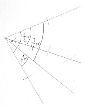 . Przy pomocy cyrkla, zakreśl dwa łuki o równym promieniu na każdym z jego dwóch ramion. Z punktów przecięcia łuków z ramionami kąta, przy pomocy cyrkla, zakreśl dwa łuki o równym promieniu tak, by przecięły się w jednym punkcie, a następnie narysuj prostą przechodzącą przez ten punkt i wierzchołek kąta. Czynność powtórz dla jednego z powstałych kątów o mierze