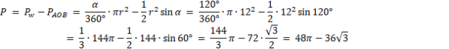 Należy obliczyć pole części koła, którą ogranicza łuk o kącie środkowym α oraz odcinek łączący końce tego łuku na okręgu o promieniu r. Konkretne wartości α i r wynoszą odpowiednio 120° oraz 12.