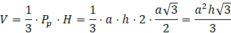 Podstawą ostrosłupa jest jedna ze ścian bocznych graniastosłupa, a jego wysokością jest przekątna równa dwóm wysokościom trójkąta równobocznego, z których składa się sześciokąt foremny. Mamy więc: