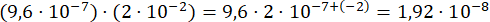 Pomnóż liczby zapisane w notacji wykładniczej: wymnóż pierwszy czynnik z jednej liczy przez pierwszy czynnik drugiej liczby. To samo zrób z drugimi czynnikami liczb – pamiętaj, że mnożąc potęgi o tych samych podstawach, musisz dodać do siebie wykładniki, a podstawy pozostają bez zmian. Wynik zapisz w postaci notacji wykładniczej.