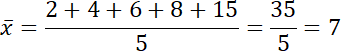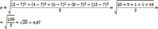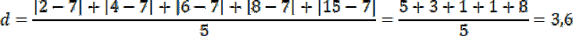 Należy policzyć dla liczb: 2, 4, 6, 8, 15; czy odchylenie przeciętne jest mniejsze, równe czy większe od odchylenia standardowego.