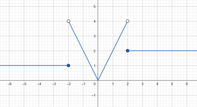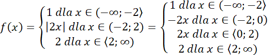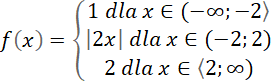 zapisz bez użycia symbolu wartości bezwzględnej, zauważ, że jeśli jest to liczba dodatnia, to jej wartość bezwzględna jest tą liczbą, a jeśli jest to liczba ujemna, to jej wartością bezwzględną jest liczba przeciwna. Wybierz krańcowe argumenty, które będą należały do przedziałów każdej z dwóch funkcji i wyznacz ich wartości dla wzoru funkcji