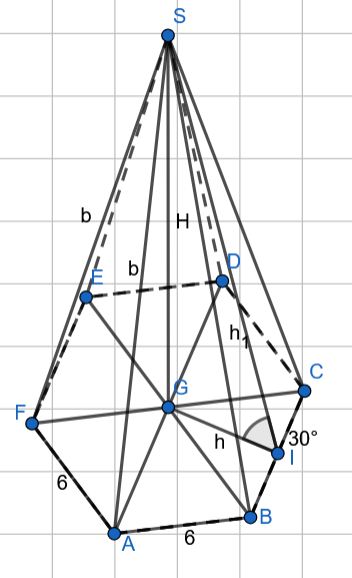 Wyznacz pole powierzchni całkowitej i objętość ostrosłupa, jeżeli jego podstawą jest sześciokąt, ściana boczna ostrosłupa prawidłowego jest nachylona do podstawy pod kątem