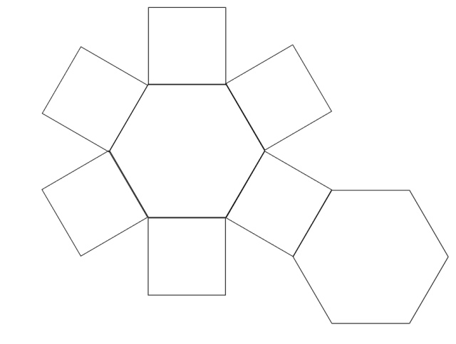 Zacznij od narysowania sześciokąta o boku 2 cm. Następnie do każdego boku dorysuj kwadrat o boku 2 cm i do boku wybranego kwadratu dorysuj sześciokąt o boku 2 cm.