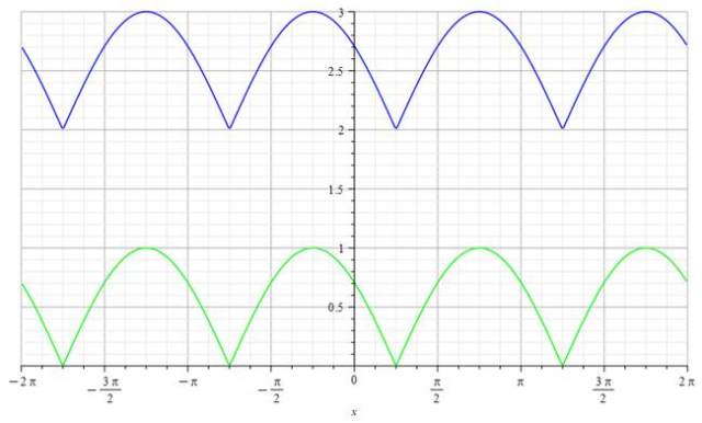 Ostatecznie przesuwasz całość do góry o 2, otrzymując niebieski wykres funkcji: