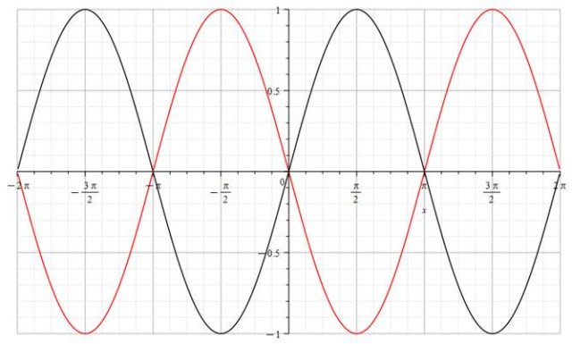 (kolor czarny). Następnie odbij ją symetrycznie względem osi OX, dostając czerwony wykres funkcji: