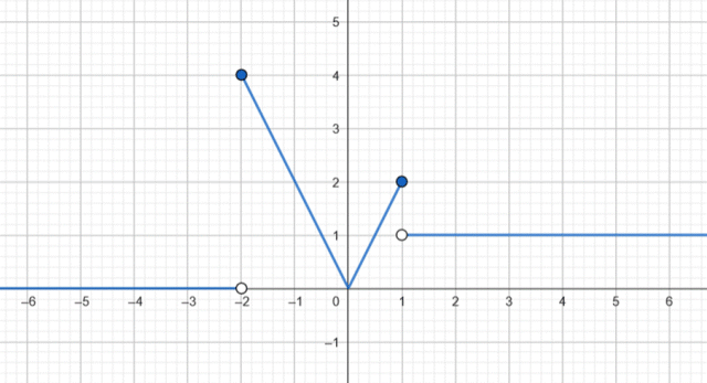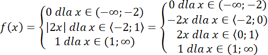zapisz bez użycia symbolu wartości bezwzględnej, zauważ, że jeśli jest to liczba dodatnia, to jej wartość bezwzględna jest tą liczbą, a jeśli jest to liczba ujemna, to jej wartością bezwzględną jest liczba przeciwna. Wybierz krańcowe argumenty, które będą należały do przedziałów każdej z dwóch funkcji i wyznacz ich wartości dla wzoru funkcji