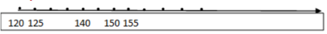 Należy narysować oś liczbową ze strzałką skierowaną w prawo i dobrać odpowiednią jednostkę osi, w tym przypadku najlepszą jednostką będzie 5. Następnie należy zaznaczyć liczby. Pamiętaj, że poruszając się w prawo, wartości liczb wzrastają o 5, a poruszając się w lewo, maleją o 5. Należy pamiętać, że oś liczbowa nie musi zaczynać się od wartości równej 0, lecz może jak w tym zadaniu zaczynać się od na przykład 120.