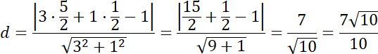 Odległość punktu P(x0, y0) od prostej l o równaniu ogólnym: Ax + By + C = 0 wyraża się za pomocą wzoru:
