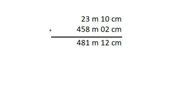W tym zadaniu musisz wykonać dodawanie: 23 m 10 cm + 458 m 02 cm.