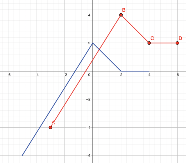Aby naszkicować wykres funkcji f, połącz punkty ABCD, a następnie przenieś tą funkcję o 2 jednostki w dół oraz 2 jednostki w lewo: