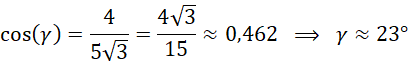 Najpierw zastosuje funkcję cosinus, aby wyznaczyć miarę kąta przy wierzchołku. Kolejno odczytaj z tablic trygonometrycznych przybliżoną miarę tego kąta. Drugi kąt ostry oblicz jako różnicę dwóch pozostałych kątów, czyli γ i 90°.