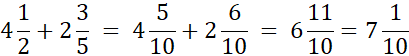 Rozszerz ułamki do mianownika 10 i wykonaj dodawanie. Liczby całkowite znajdujące się przed ułamkami dodaj do siebie niezależnie od ułamków.
