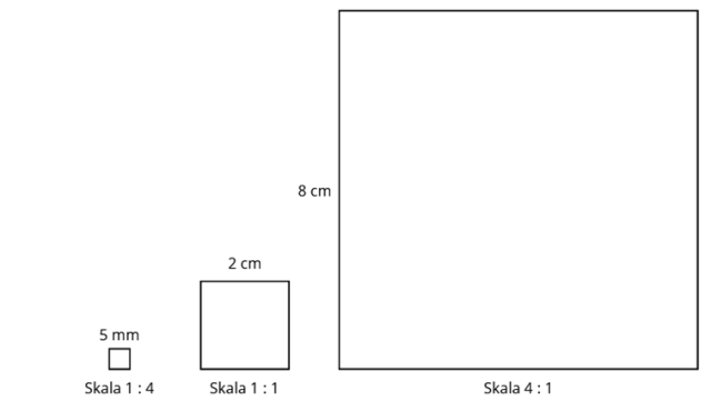 W tym zadaniu narysuj kwadrat, którego bok ma długość 2 cm, a następnie wykonaj rysunki w skalach 1 : 4 i 4 : 1.