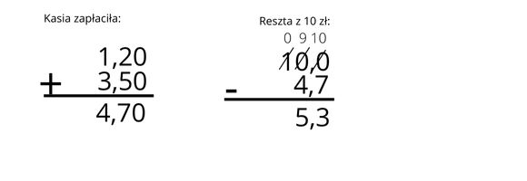 Oblicz, ile reszty z 10 zł otrzymała Kasia po zakupie ołówka za 1,20 zł oraz przyborów za 3,50 zł.
