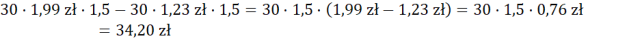 Aby otrzymać różnicę kosztów, musisz na początek pomnożyć cenę butelki przez ilość dni i ilość, jaką wypija dziennie pan Jan. Pamiętaj, że czerwiec ma 30 dni. Na koniec wykonaj odejmowanie.