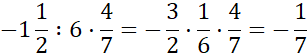 Na początek zapisz liczbę mieszaną jako ułamek niewłaściwy oraz zapisz dzielenie jako mnożenie przez odwrotność podanej liczby. Pomnóż liczby, skracaj ułamki, gdy to możliwe. Pamiętaj, ze iloczyn nieparzystej ilość liczb ujemnych jest ujemny. Na koniec zapisz liczbę, która jest odwrotna do otrzymanego wyniku – zamień miejscami licznik z mianownikiem, znak pozostaw bez zmian.