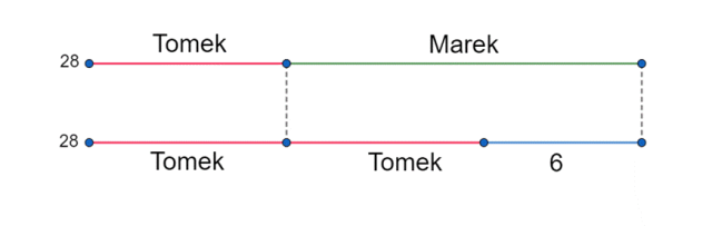 Narysuj odcinek przedstawiający wiek Tomka oraz odcinek przedstawiający wiek Marka. Po połączniu ze sobą tych odcinków w jeden otrzymasz odcinek o długości 28. Zauważ, odcinek Marka można podzielić na dwie części: odcinek równy długości odcinka Tomka i odcinek o długości 6. Ten odcinek ma taką samą długość co odcinek Marka, czyli suma odcinków wciąż wynosi 28. Po skróceniu go o fragment długi na 6 otrzymasz 22, i tyle wynoszą dwa odcinki Tomka – jeden to 11. Marek ma o 6 lat więcej, czyli jego odcinek to 11 + 6 = 17. Możesz wykonać sprawdzenie, dodaj do siebie wiek Marka i Tomka, wynik powinien wynosić 28.