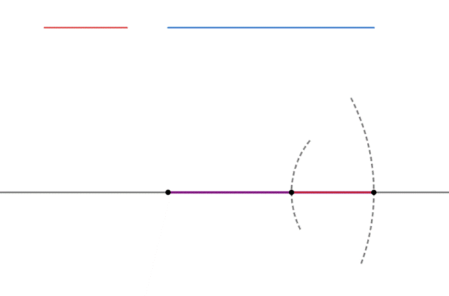 Najpierw za pomocą linijki narysuj dowolne dwa odcinki – nie zwracaj uwagę na wartości na podziałce, nie będą nam potrzebne. Teraz w innym miejscu narysuj fragment prostej i na niej zaznacz w dowolnym miejscu punkt – w tym miejscu zacznie się odcinek. Następnie cyrklem odmierz długość dłuższego narysowanego odcinka – jedną nóżkę przyłóż do jednego końca, a drugą – do drugiego końca odcinka. Nie zmieniając wymiarów na cyrklu, wbij ostro zakończony koniec w miejsce punktu na prostej, a następnie rysikiem zatocz łuk. Łuk przetnie się w jednym miejscu z prostą, w tym miejscu znajduje się drugi koniec pierwszego odcinka. Dokładnie tutaj wbij cyrkiel, na którym wcześniej odmierz długość drugiego odcinka. Ponownie zatocz łuk – tym razem łuk musi być zwrócony w drugą stronę, aby skrócić pierwszy odcinek, miejsce przecięcia się łuku z pierwszym odcinkiem na prostej to miejsce drugiego końca szukanego odcinka (pierwszy koniec to pierwszy narysowany punkt na prostej).