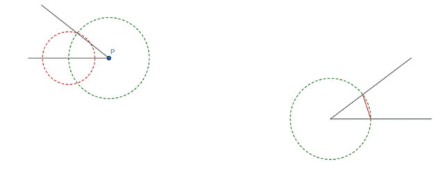Na początek za pomocą linijki narysuj dowolny kąt ostry. O naszej konstrukcji wiemy tylko tyle, że wierzchołek kąta znajduje się w punkcie P, czyli brakuje nam dwóch jego ramion. Oznacza to, że możemy wybrać dowolne położenie pierwszego ramienia, a od drugiego będzie dzieliła go alfa. Półprostą zaczynającą się w danym punkcie można wybrać na nieskończenie wiele sposobów, co daje nam tyle samo rozwiązań zadania. Po narysowaniu półprostej zatocz dowolny łuk na początkowym kącie alfa, a taki sam łuk zatocz od punktu P. Teraz odmierz odległość między ramionami w pierwszym kącie i zatocz łuk o takim samym promieniu, wbijając cyrkiel w miejsce przecięcia się narysowanej półprostej i pierwszego łuku. Połącz miejsce przecięcia się łuków z punktem P.