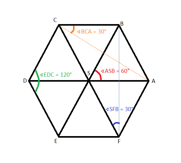 Sześciokąt foremny ABCDEF został podzielony na trójkąty równoboczne, czyli takie, które mają wszystkie kąty o mierze 60°. ∢ASB to właśnie jeden z kątów trójkąta, ma on więc miarę 60°. Kąty ∢BCA i ∢SFB to połowy kątów trójkąta, wynoszą więc po 30°. Kąt ∢EDC to dwa kąty trójkąta równobocznego, ma on więc 120°.