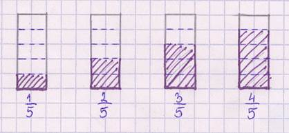 Po narysowaniu jednakowych prostokątów podziel je na 5 równych części. Zadanie mogą ułatwić Ci kratki w zeszycie. Następnie zaznacz kolorem 1, 2, 3 i 4 części narysowanego prostokąta.