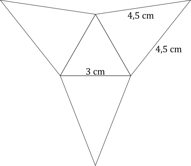 Żeby narysować siatkę ostrosłupa najpierw rysujemy odcinek o długości 3 cm. Następnie cyrklem rozwartym na 3 cm rysujemy dwa łuki, wbijając cyrkiel kolejno w oba końce odcinka. Miejsce przecięcia się łuków jest trzecim wierzchołkiem podstawy, łączymy go odcinkami z końcami pierwszego odcinka. Żeby narysować ściany boczne, rozwieramy cyrkiel na 4,5 cm i rysujemy dwa łuki, wbijając cyrkiel kolejno w dwa wierzchołki podstawy, miejsce przecięcia się łuków jest trzecim wierzchołkiem ściany bocznej, łączymy go z końcami boku podstawy. Analogicznie postępujemy dla pozostałych dwóch boków podstawy.