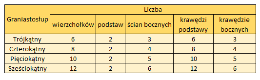 Wpisz do tabeli liczbę wierzchołków, podstaw, ścian bocznych, krawędzi podstawy i krawędzi bocznych danego graniastosłupa.