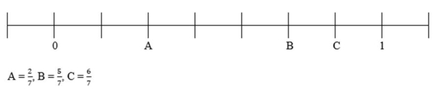 Narysuj oś i podziel równo na 7 części. Punkt A zaznacz na drugiej podziałce, punkt B na piątej podziałce, a punkt C na szóstej podziałce.