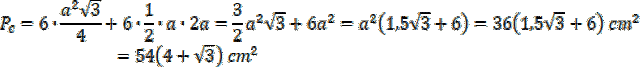 Pole powierzchni całkowitej ostrosłupa Oblicz, dodając do pola podstawy pole sześciu ścian bocznych. Pole podstawy policz, mnożąc 6 razy pole trójkąta foremnego o krawędzi 6 cm.