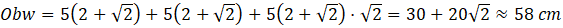i obliczyć obwód trójkąta prostokątnego równoramiennego w przypadku, gdy najkrótsza wysokość jest o 5 cm krótsza od przyprostokątnej.
