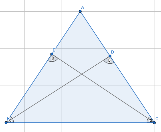 ) równoramiennego, że kąty przy podstawie są równe i z tego, że kąty przy spodzie wysokości są proste.