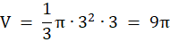 W tym zadaniu musisz obliczyć objętość stożka, wiedząc, że jego przekrój osiowy o wysokości 3 jest trójkątem prostokątnym.