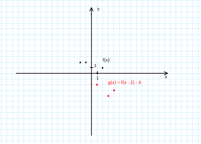 W tym zadaniu musisz określić które z podanych wykresów przedstawia wykres funkcji g(x) = f(x – 2) – 4, jeśli funkcja f jest określona przez podaną tabelkę.
