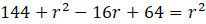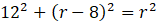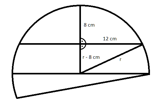 Dorysuj średnicę tego talerza (pozioma dolna linia). Odcinek o długości 8 cm jest częścią długości promienia tego talerza, więc pozostały odcinek będzie miał długość promienia pomniejszonego o 8 cm. Ze środka talerza, do punktu na okręgu, z którego wychodzi górna pozioma linia (podana na rysunku w zadaniu) możesz także poprowadzić promień. Otrzymujesz trójkąt prostokątny o bokach 12 cm, r – 8cm oraz przeciwprostokątnej o długości r. Z twierdzenia Pitagorasa możesz ułożyć równanie: