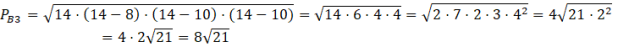 Ponieważ znasz długości wszystkich trzech boków trójkąta będącego trzecią ścianą boczną, aby policzyć jego pole skorzystaj ze wzoru Herona na pole trójkąta. Obwód tego trójkąta wynosi: 8 + 10 + 10 = 28, więc potrzebna do tego wzoru połowa obwodu wynosi 14.